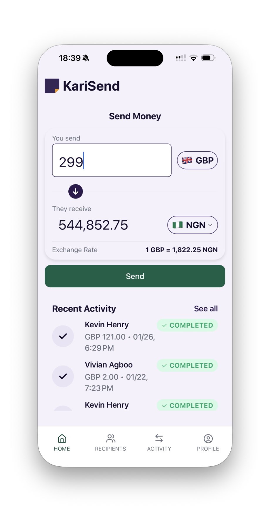 Select your recipient from your contacts and value is delivered directly to their local NGN bank account.